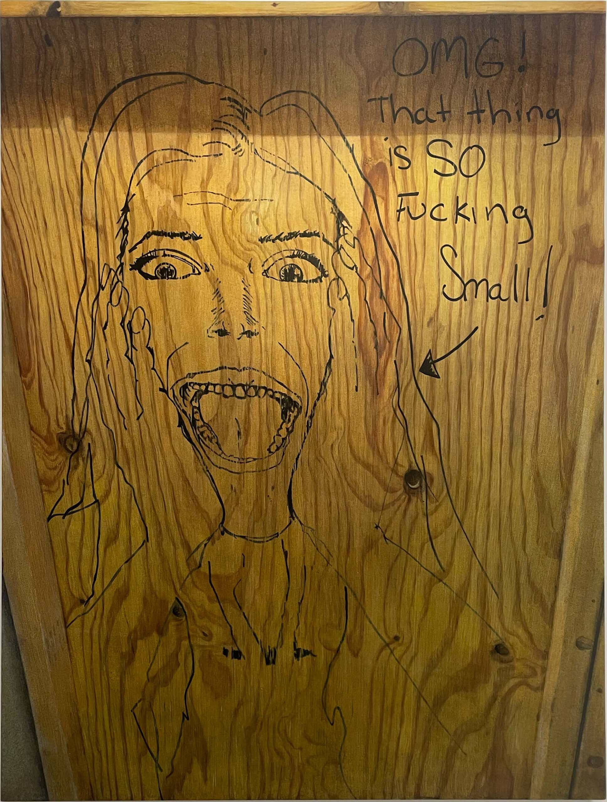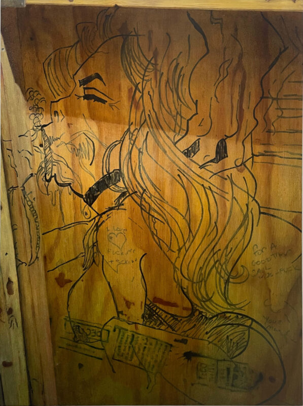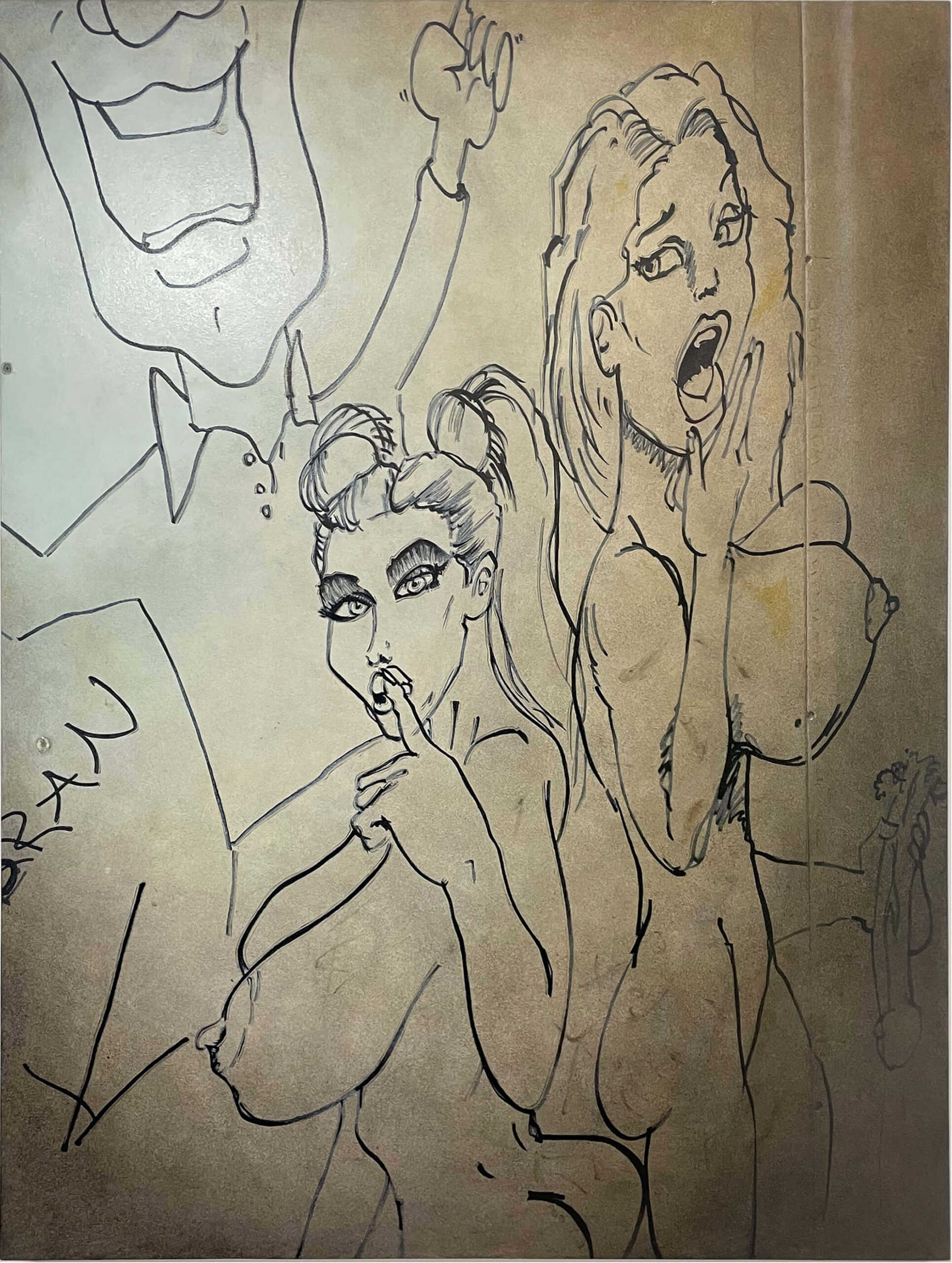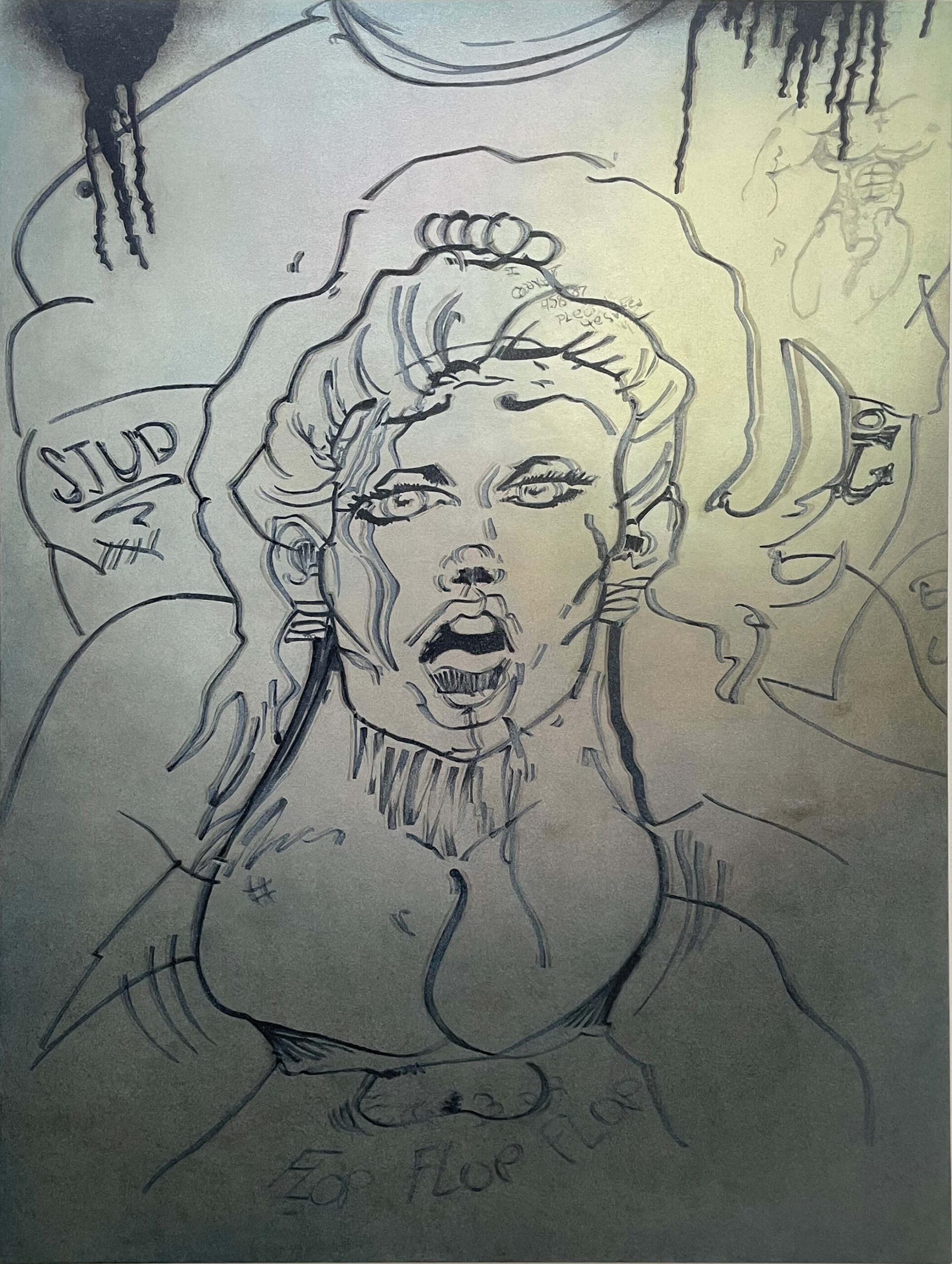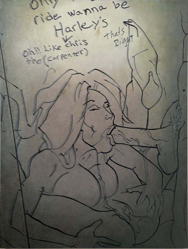 The twelve paintings in this series adhere to the Soliloquies of the Aggrieved works in concept and process, however, these images set themselves apart in some unique ways. The illustrator, one man, of these images single-mindedly fetishized and homed in on one specific theme: the overtly sexualized objectification of women’s bodies and sexual acts as per societal stereotypes of the male gaze and fantasies. But what truly sets them apart is not only the time and energy, and quality of draftsmanship- anatomical correctness, foreshortening, line-value, assuredness of mark-making- but the individuality of the women depicted: some have straight hair and narrow Caucasian features, while others have curly hair and more full rounder facial features that are suggestive of black or Latina women. One has bad teeth. Some have hoop earrings, others pearl necklaces, another a choker, one wears a tiara, and a few even wear collared shirts… Each woman is a unique character. The attention to detail of these drawings, done freehand in situ in temporary construction site shanty-like bathroom stalls during a work shift, is both unique and bizarrely impressive.