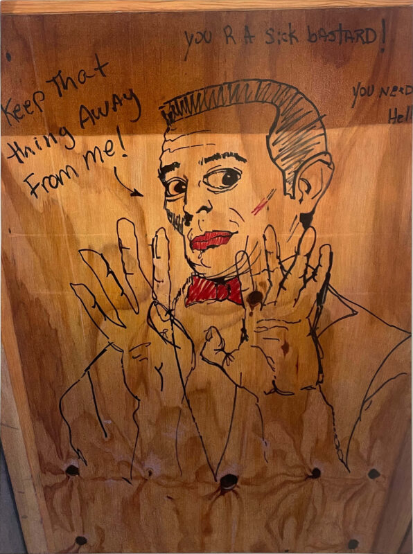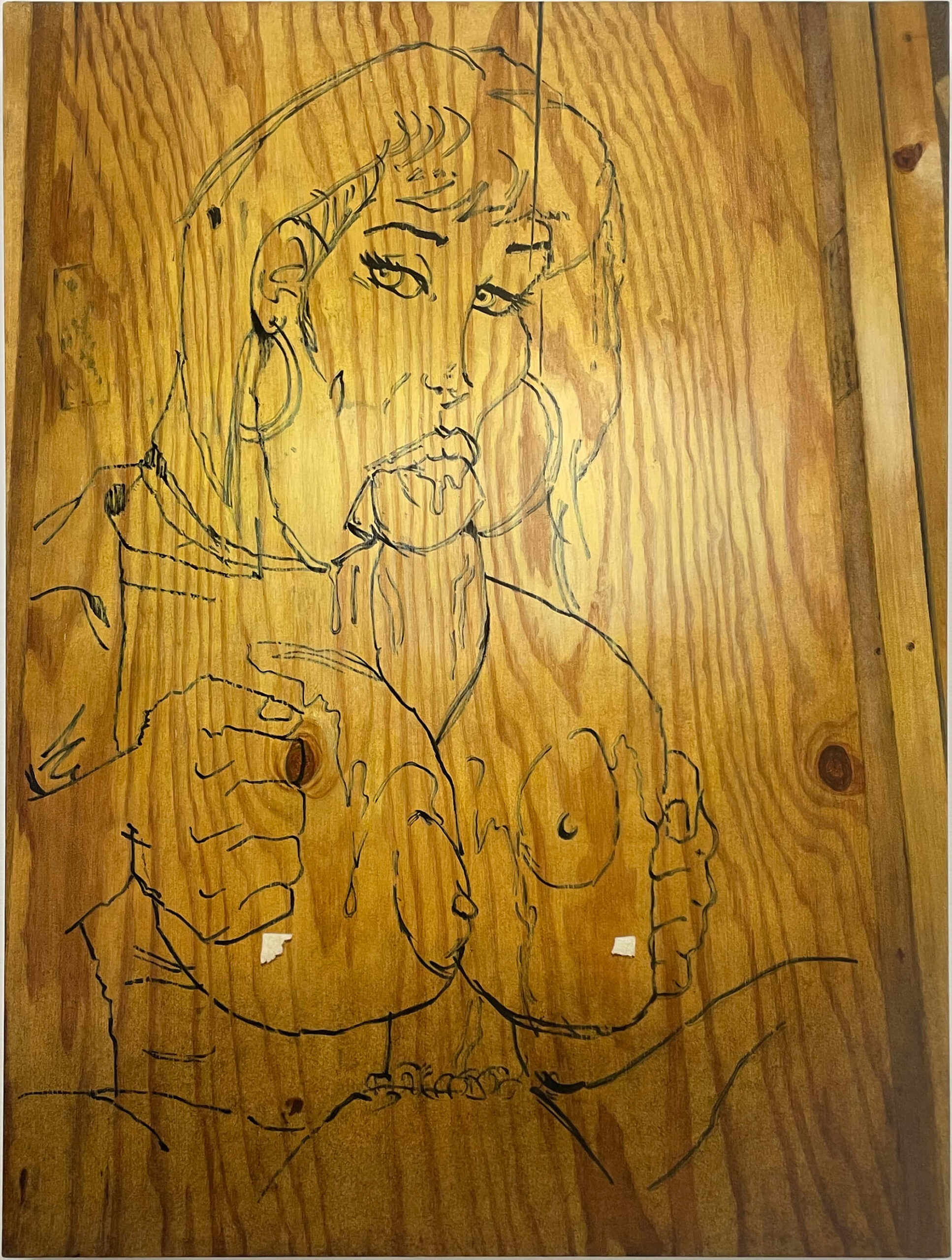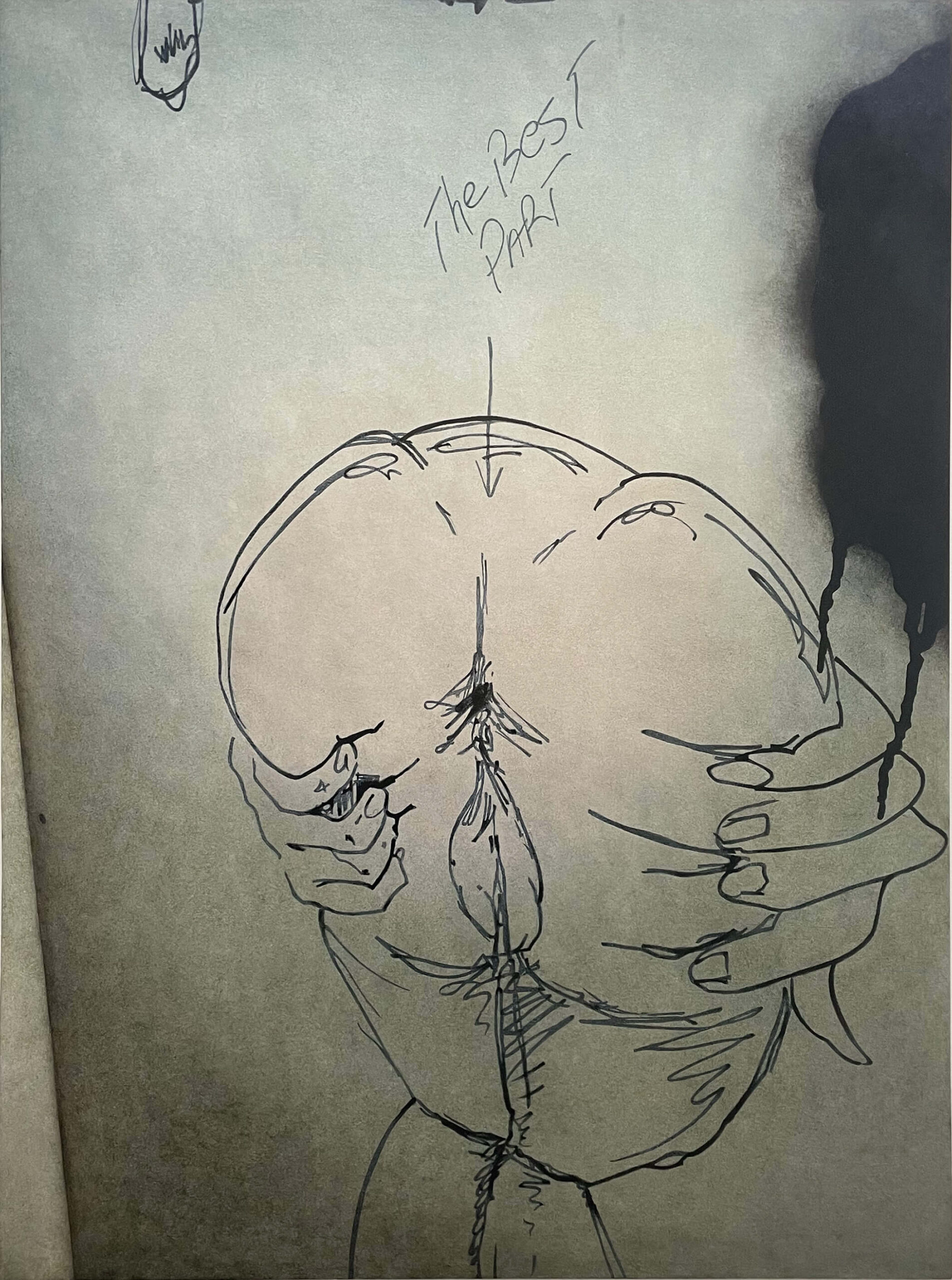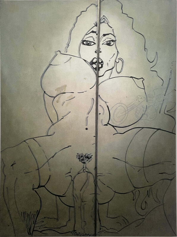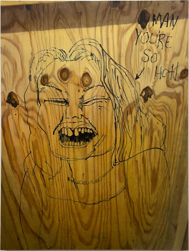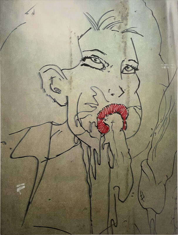 The twelve paintings in this series adhere to the Soliloquies of the Aggrieved works in concept and process, however, these images set themselves apart in some unique ways. The illustrator, one man, of these images single-mindedly fetishized and homed in on one specific theme: the overtly sexualized objectification of women’s bodies and sexual acts as per societal stereotypes of the male gaze and fantasies. But what truly sets them apart is not only the time and energy, and quality of draftsmanship- anatomical correctness, foreshortening, line-value, assuredness of mark-making- but the individuality of the women depicted: some have straight hair and narrow Caucasian features, while others have curly hair and more full rounder facial features that are suggestive of black or Latina women. One has bad teeth. Some have hoop earrings, others pearl necklaces, another a choker, one wears a tiara, and a few even wear collared shirts… Each woman is a unique character. The attention to detail of these drawings, done freehand in situ in temporary construction site shanty-like bathroom stalls during a work shift, is both unique and bizarrely impressive.